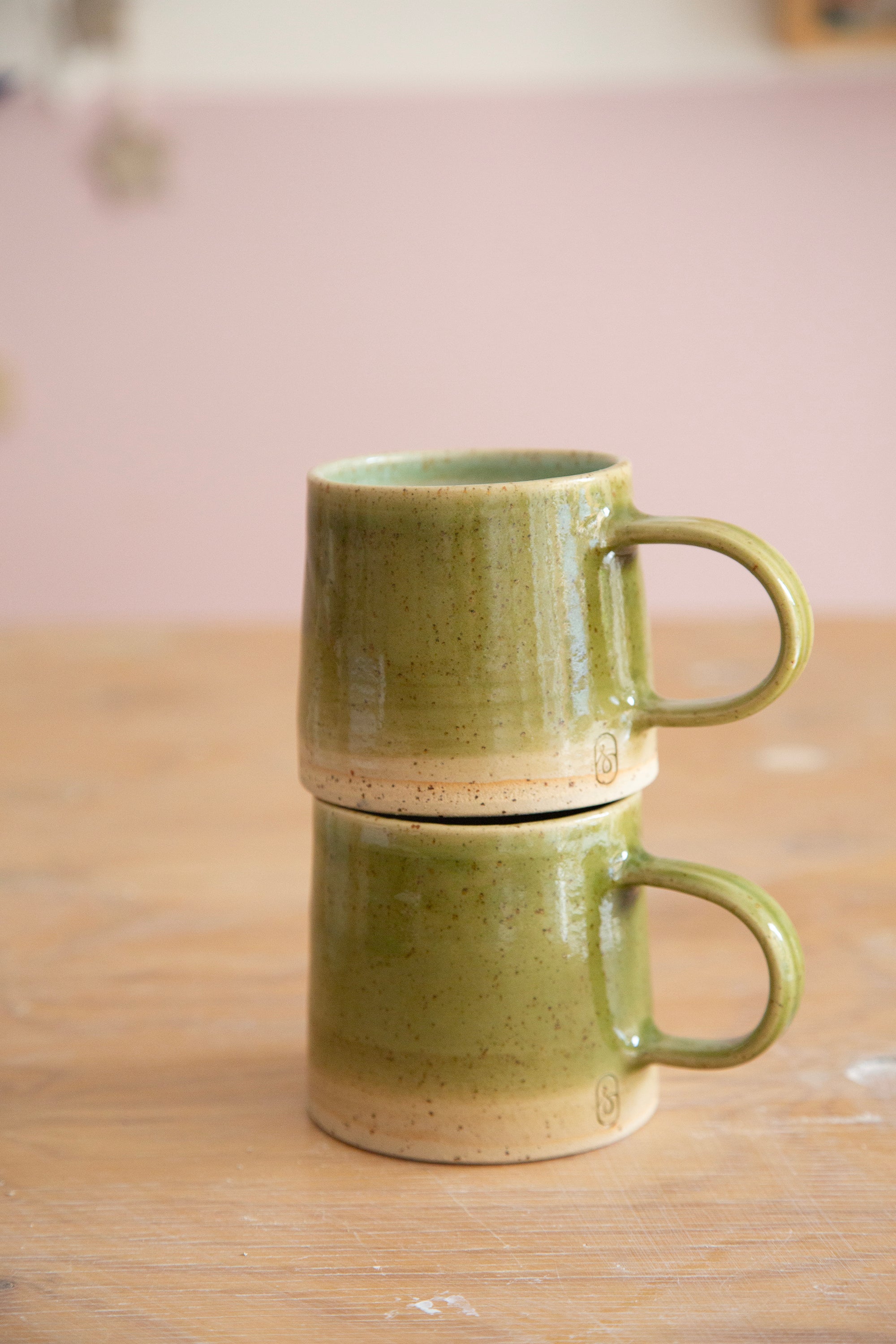 Mug realizzata a mano, al tornio, in grès e smaltata con smalti atossici altezza 8cm, diametro 8cm, ingombro con manico 13,5cm, capienza 38cl